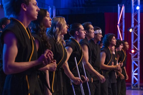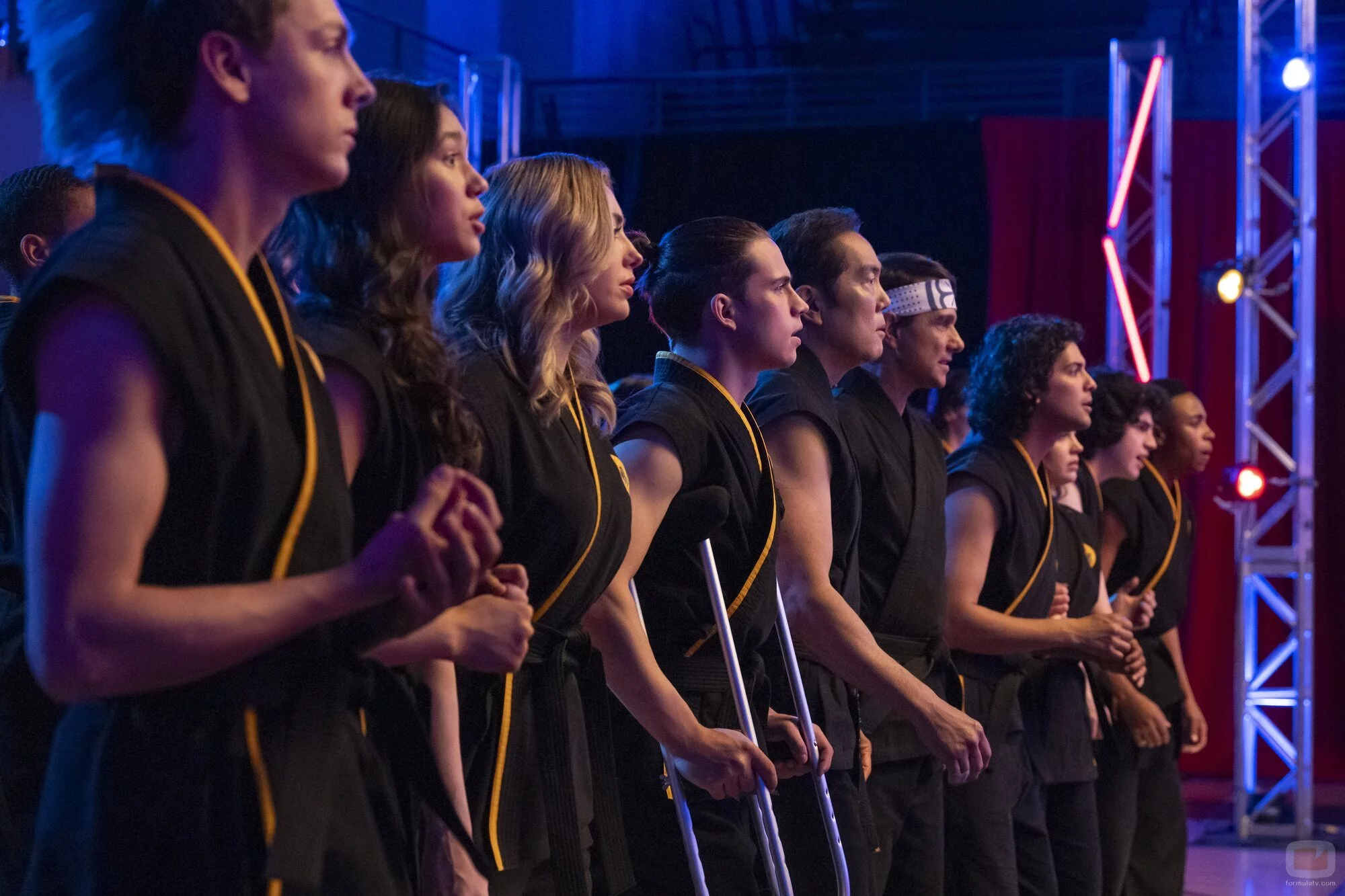 Mary Mouser, Ralph Macchio, Jacob Bertrand, Dallas Dupree Young, Peyton List, Xolo Maridueña y Tanner Buchanan aparecen en una escena del capítulo 6x15 de 'Cobra Kai'.