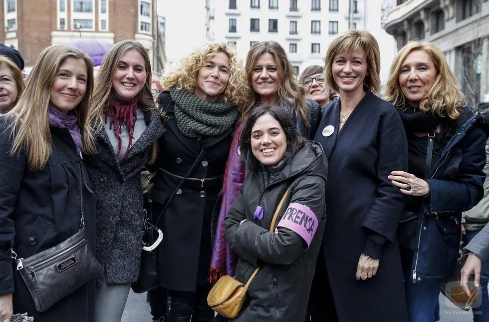 La presentadora de 'Espejo público' junto a Cristina Fernández y al resto de colaboradoras del programa en la plaza de Callao participando en la manifestación del Día Internacional de la Mujer.