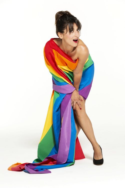 La humorista y reportera se enfunda la bandera del Orgullo LGTB a modo de vestido para el especial previo al estreno de 'Caramelo'.