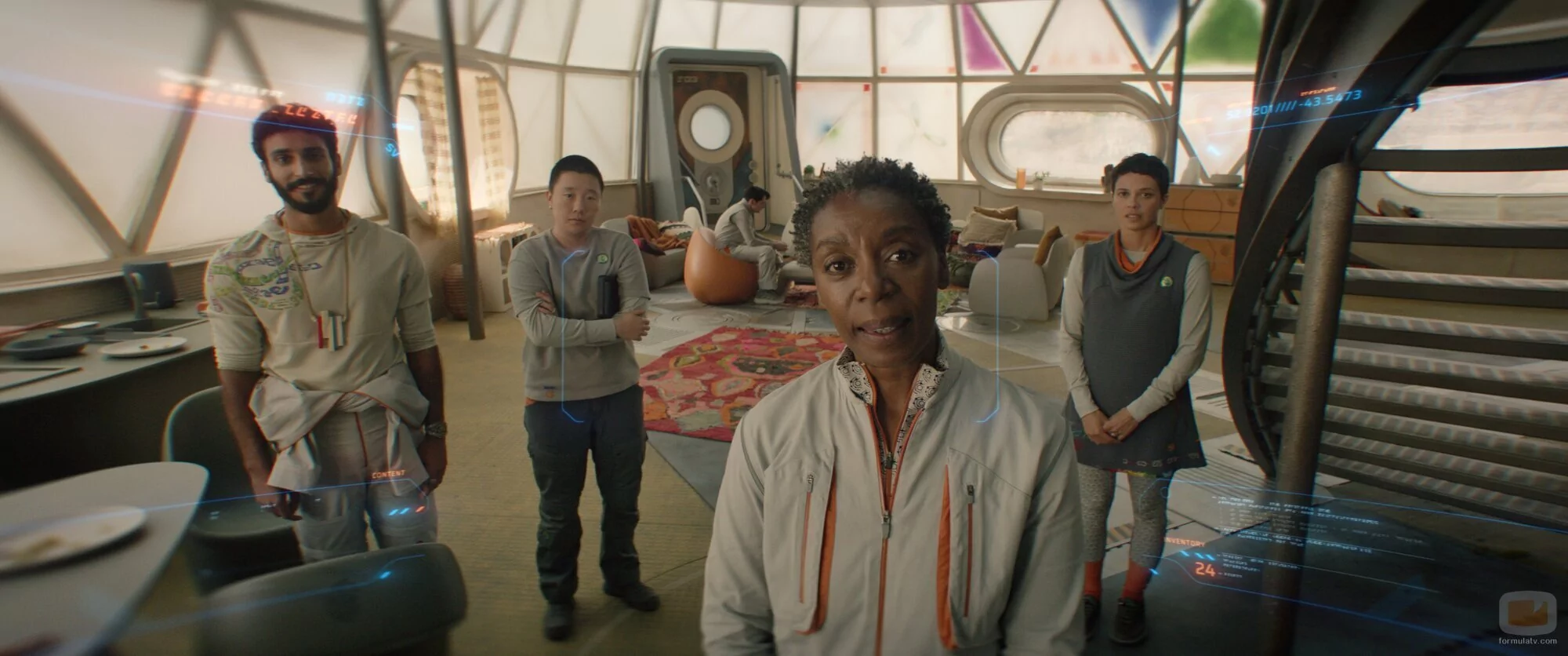 David Dastmalchian, Akshay Khanna, Noma Dumezweni y Sabrina Wu aparecen en una foto del episodio 'FreeCommerce' de 'Murderbot'.