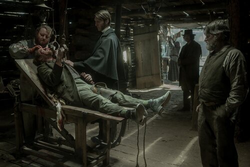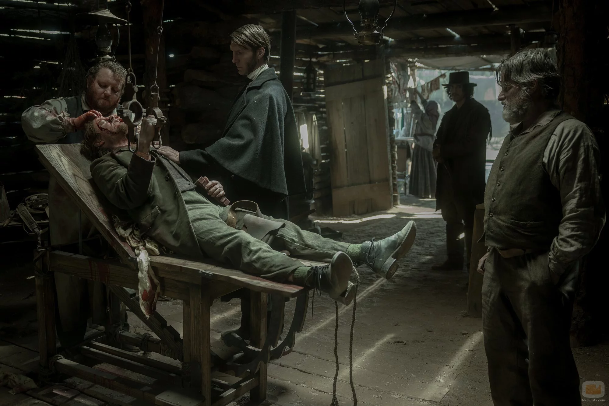Dane DeHaan, Nick Hargrove y Shea Whigham aparecen en una foto del episodio 'Episodio 2' de 'American Primeval'.