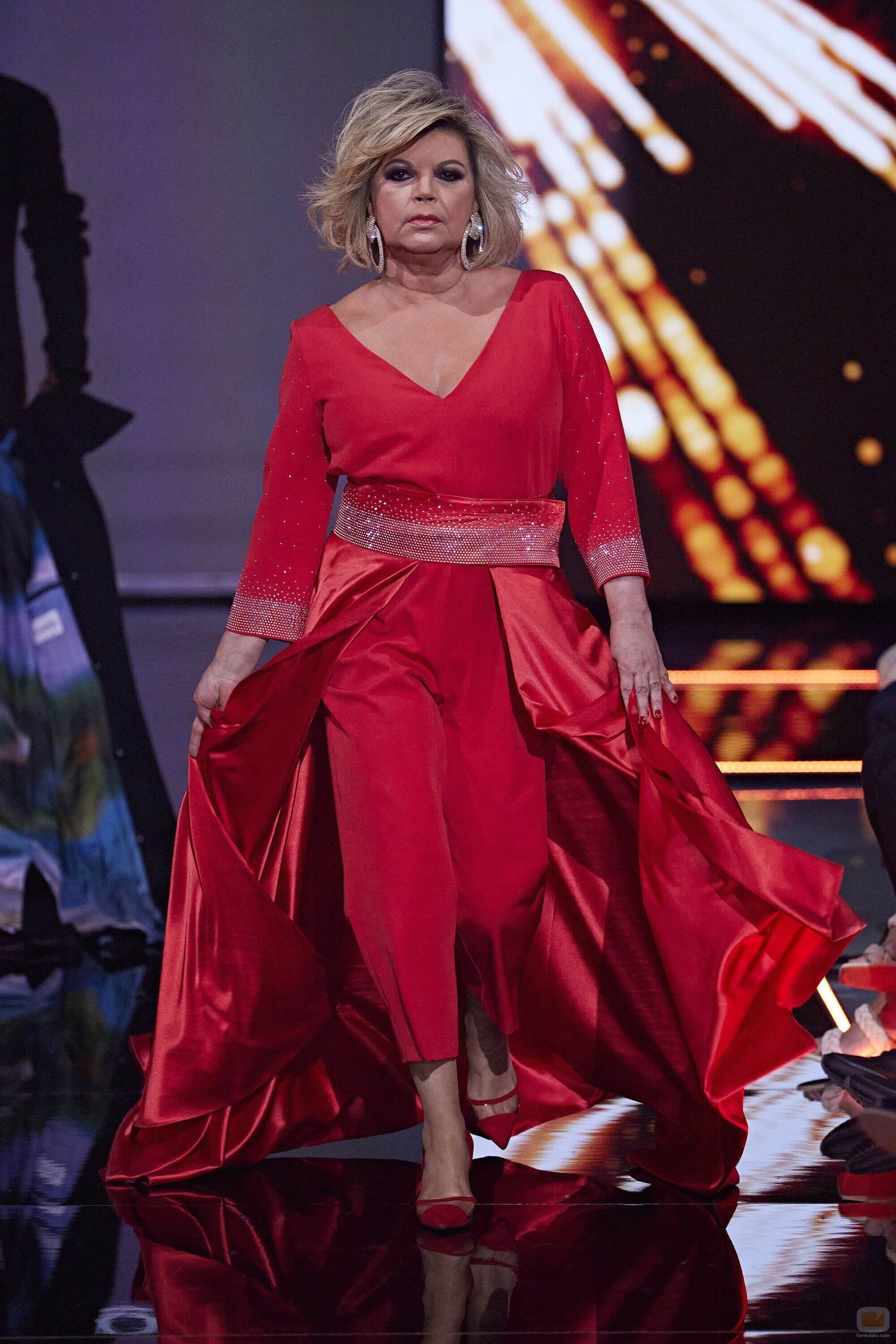 La presentadora de 'Sálvame' es una de las modelos del certamen y viste un traje rojo con un acabado en cola del mismo tono.