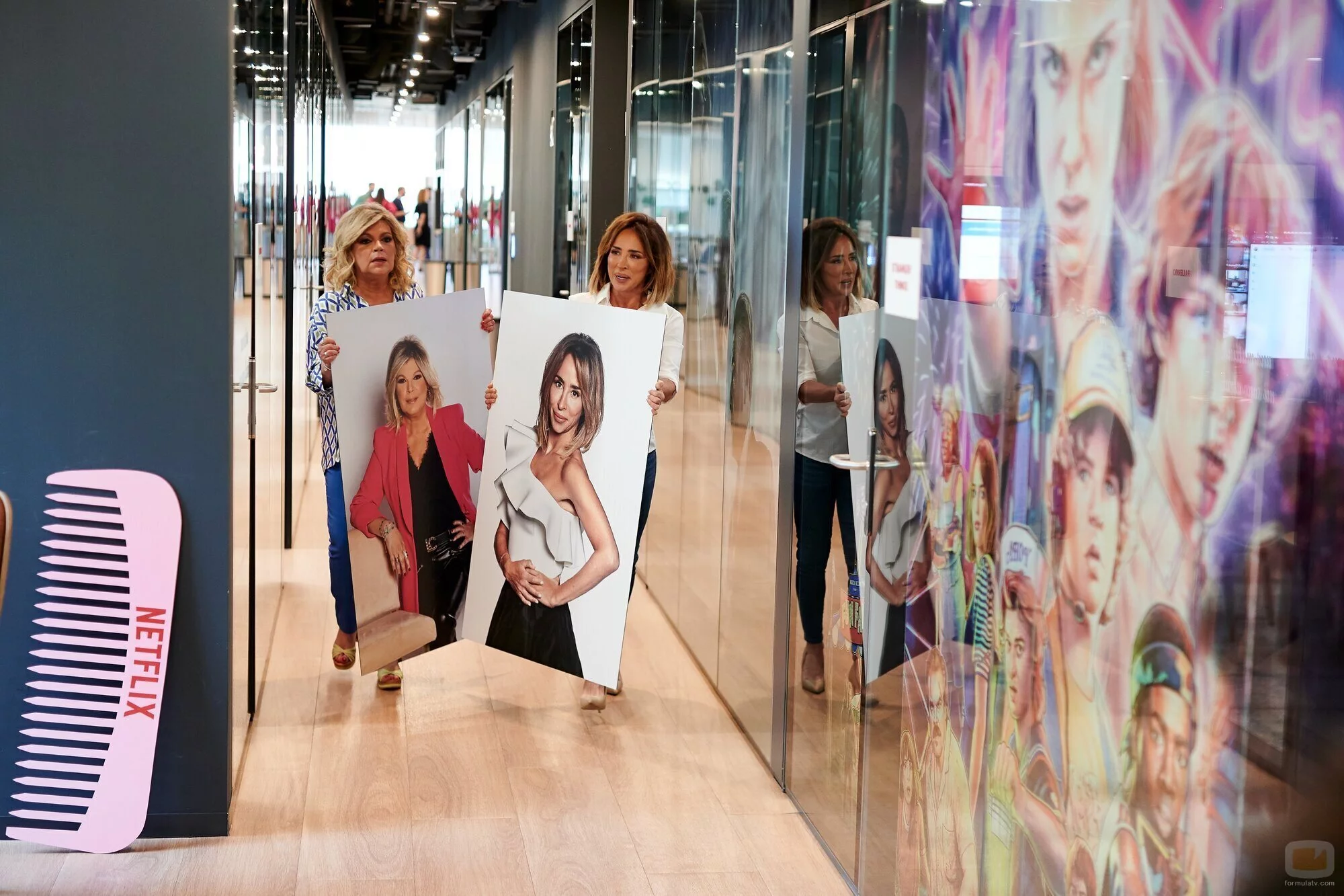 Las presentadoras de televisión Terelu Campos y María Patiño pasean por las oficinas de Netflix tras la cancelación de 'Sálvame' con sus propios cuadros, anunciando 'Sálvese quien pueda', su nueva aventura en la plataforma.