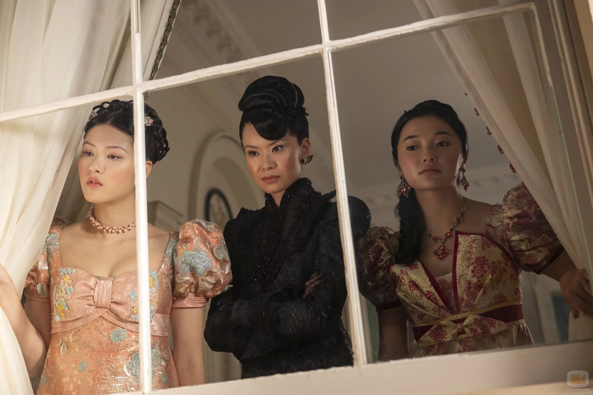 Isabella Wei, Michelle Mao y Katie Leung aparecen en una escena promocional del capítulo 4x02 de la serie 'Los Bridgerton'.