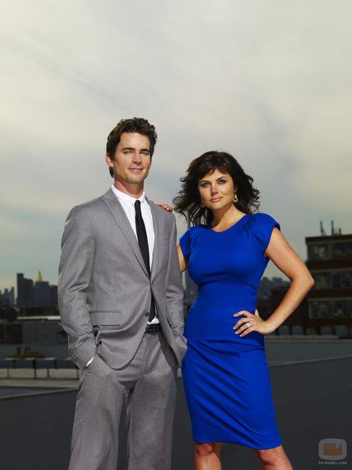 Tiffani Thiessen (Elizabeth Burke) y Matt Bomer (Neal Caffrey) en una foto promocional de 'White Collar', la serie de USA Network.