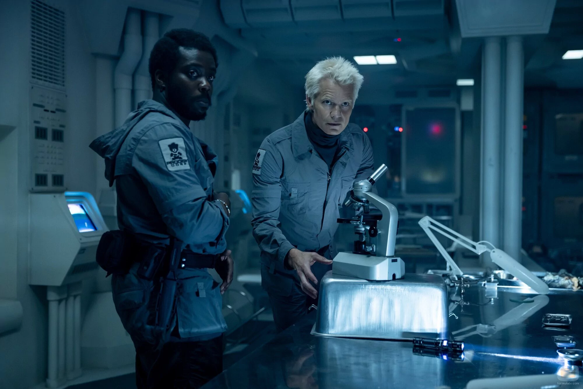 Babou Ceesay y Timothy Olyphant aparecen en una foto del episodio 'Mr. October' de la serie 'Alien: Earth', la serie de televisión de FX Network.