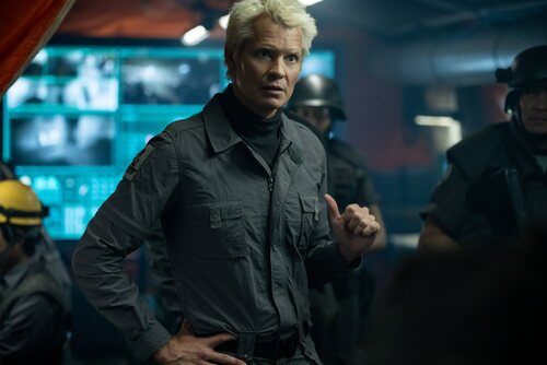 El intérprete Timothy Olyphant (Kirsh) en una imagen promocional del episodio 'Mr. October' de 'Alien: Planeta Tierra'.