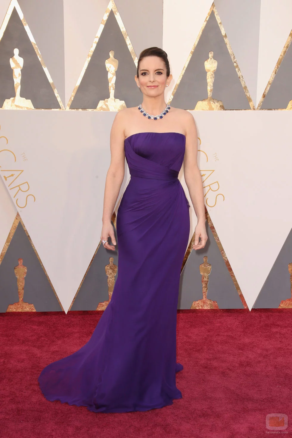 Tina Fey posa con un vestido morado de palabra de honor a juego con un collar con decoraciones del mismo color.