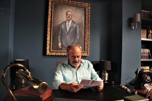 Víctor (Tito Valverde) sentado en su despacho mientras lee unos documentos en 'Alba', la nueva serie de Atresmedia.