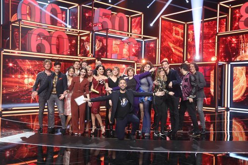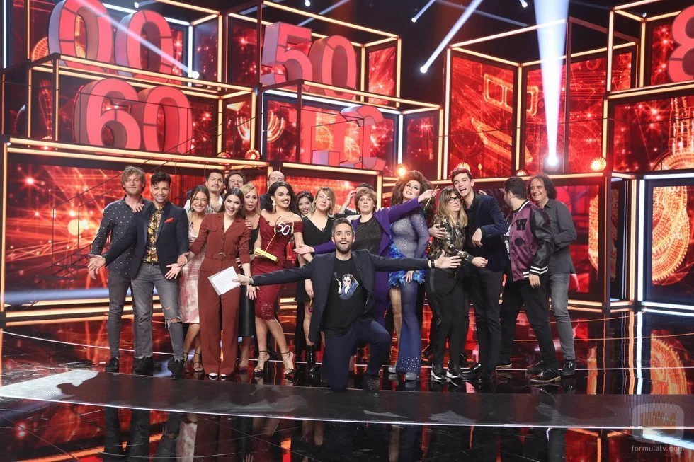 Fotografía que recoge a todos los concursantes de la cuarta gala de 'La mejor canción jamás cantada' junto al jurado y a Roberto Leal.