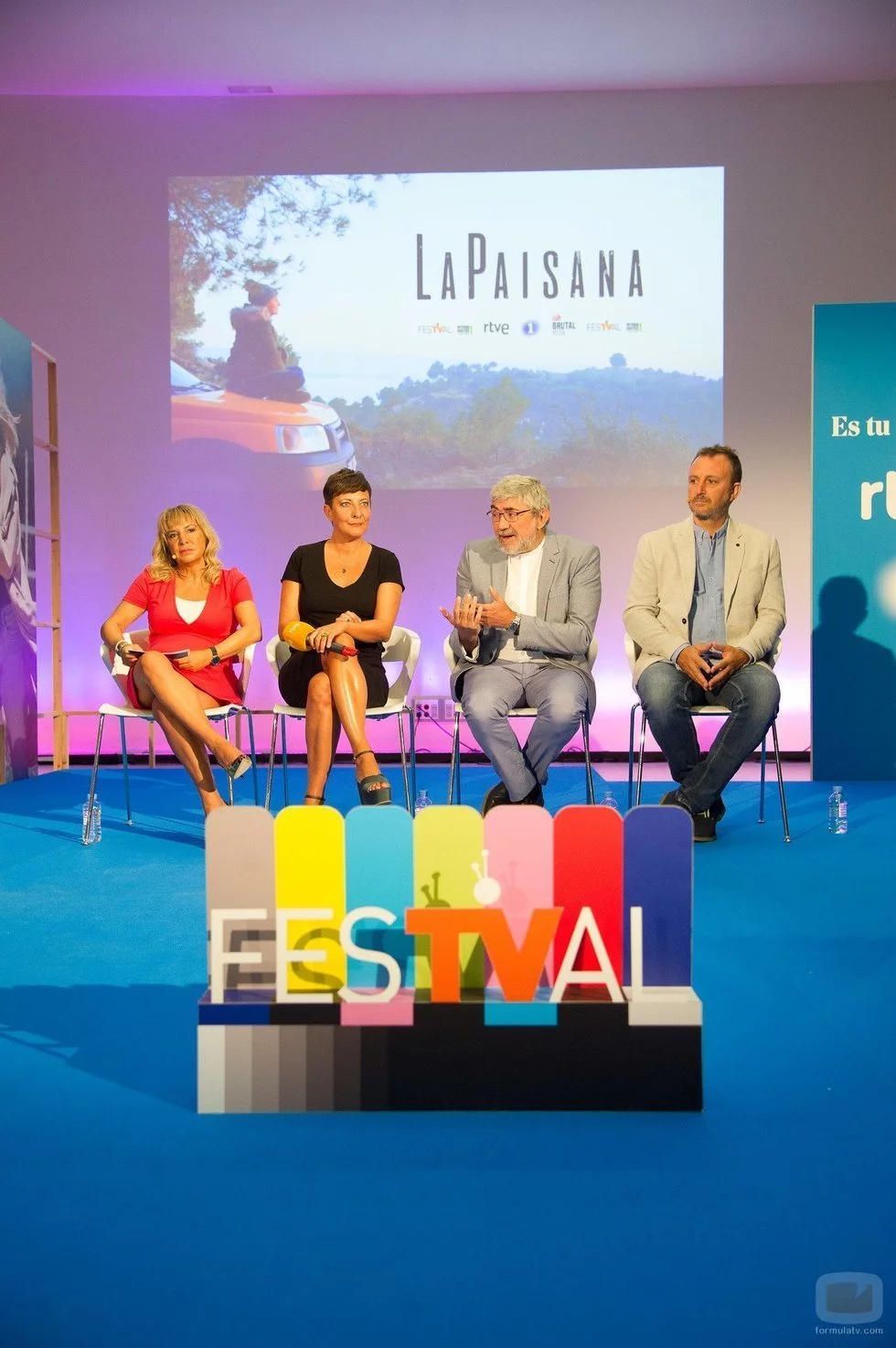 Toñi Prieto, Directora de Entretenimiento de TVE; Eva Hache, presentadora de 'La Paisana'; Fernando López Puig, Director de Contenidos de TVE, y Raimon Masllorens, presidente de Brutal Media, en la rueda de prensa de 'La Paisana' en el FesTVal de Vitoria.