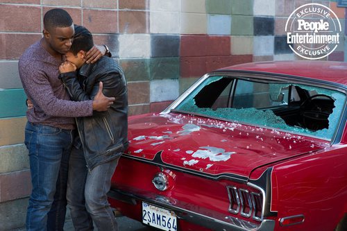 Tony (Christian Navarro) llora delante de su coche, con el cristal trasero roto, junto a Caleb, uno de los nuevos personajes interpretados por R.J. Brown de la segunda temporada de 'Por 13 razones' de Netflix.