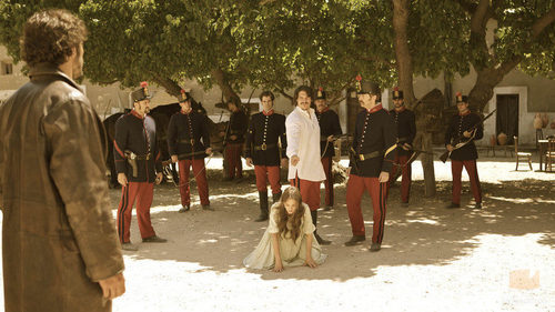 Cesar observa como Ugarte en un ataque de celos encoñana con un arma a Almudena.