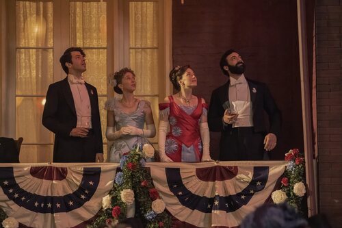 Morgan Spector, Harry Richardson, Taissa Farmiga y Carrie Coon aparecen en una foto promocional del capítulo 2x07 de 'La edad dorada'.