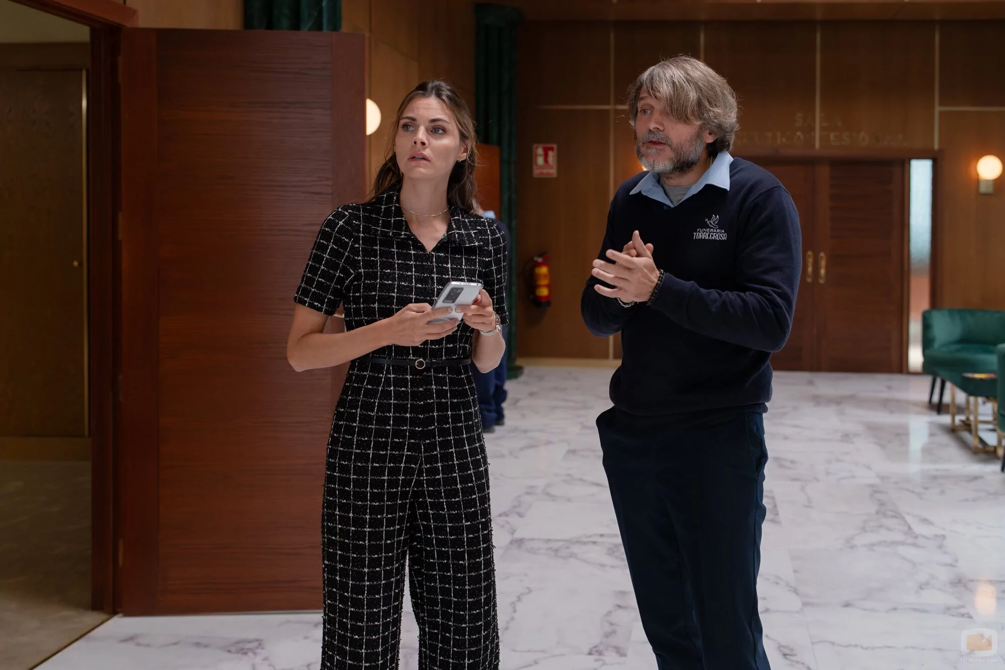 Los personajes interpretados por Amaia Salamanca y Salva Reina, juntos por los pasillos de la Funeraria Torregrossa.