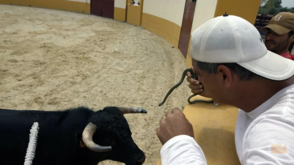 Una vaquilla que ha sido banderilleada se acerca a Frank Cuesta, mientras él explica el proceso que sufre en 'Wild Frank: Toros'.