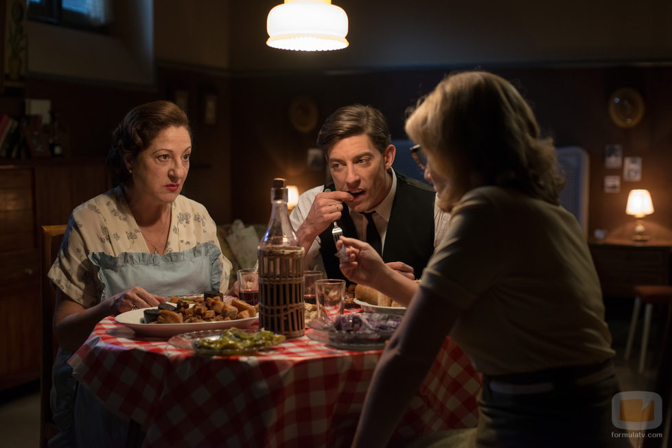 (03x03) Mientras están cenando en un restaurante, Concha (Rosario Pardo) mira con cara de desprecio a la novia de su hijo.