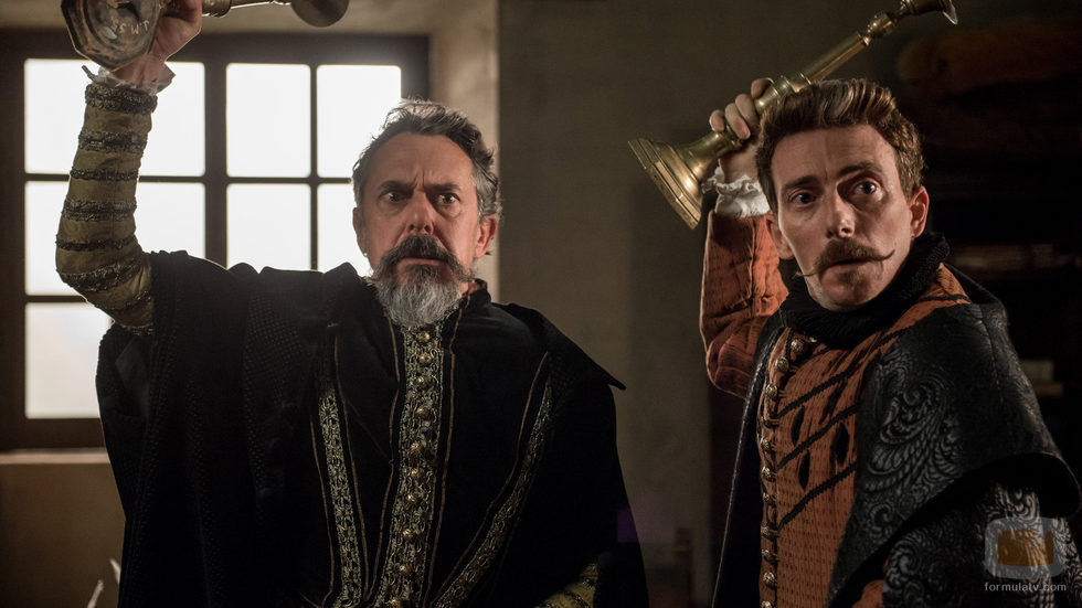 Víctor Clavijo y Pere Ponce cuyos papeles son los de Lope de Vega y Cervantes se encuentran en una de las escenas de 'El Ministerio del Tiempo'.