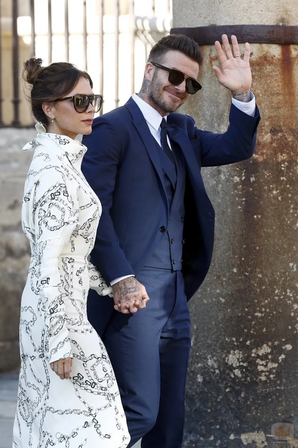 Victoria y David Beckham posando juntos antes de entrar en la Iglesia donde se celebraba la boda de Pilar Rubio y Sergio Ramos.