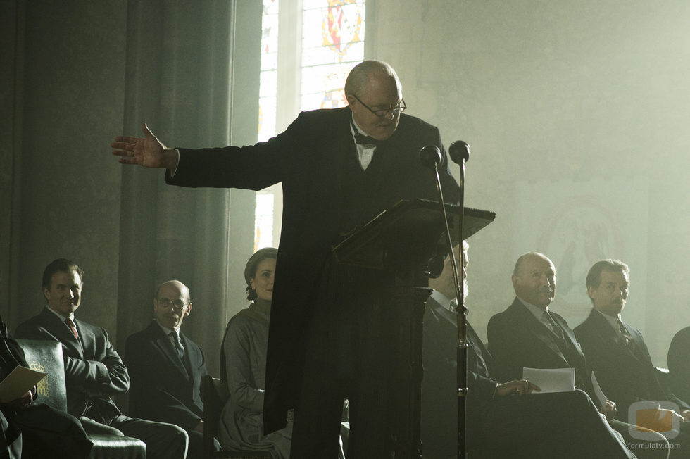 Winston Churchill, en 'The Crown', haciendo gestos ostensibles con la mano, mientras da un discurso ante la atenta mirada de los asistentes.