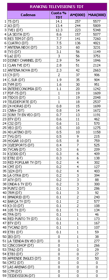 En enero encontramos una paradoja en el mercado TDT y, en contra de lo que sucede en el total de las televisiones, Telecinco se convierte en la cadena más vista, superando tanto a Antena 3 como a La 1. Sin embargo, los malos registros de los digitales del grupo (Telecinco 2 y FDF siguen sin interesar a la audiencia) dejan al Grupo Telecinco como el tercer grupo, por detrás de Antena 3 y RTVE. Antena 3 se queda a 9 décimas de RTVE con dos canales menos.