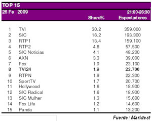 En lo referente al canal generalista, TVI obtuvo en el total del dia uno de los mejores resultados del año, al registar un share medio del 37%, seguido de RTP1 con un 31,1%. La cadena SIC ocupa la tercera posición con un 24,7% y le sigue RTP2 con 7,1%. Se trata de la cuota de mercado de los cuatro canales generalistas.