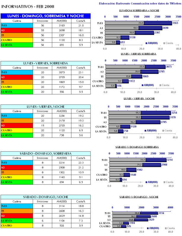 Con respecto a enero, los informativos de La 1 bajan siete décimas frente a las subidas generalizadas de todas las privadas: Antena 3 sube 2 décimas, Telecinco gana 8 décimas, Cuatro sube medio punto y laSexta 4 décimas. Destaca la subida de 'Noticias Cuatro 1' a mediodía, que mejora sus registros en 1 punto.