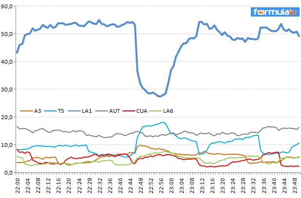 El minuto de oro del partido en La 1 se produjo a las 22:32 horas, cuando Touré marcaba el gol del empate. En ese instante, 11.787.000 espectadores, el 55,1% de la audiencia, seguía la sintonía de la cadena pública.