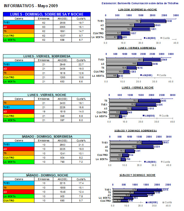 Ana Blanco se corona un mes más como la más seguida, con casi 3 millones de espectadores de media. El 'Telediario 1' mejora además su audiencia en medio punto con respecto a Abril. En la sobremesa, Antena 3 baja 6 décimas, mientras que Telecinco sube 1. Cuatro gana 2 décimas y notable subida de laSexta, que gana medio punto con respecto al mes pasado.