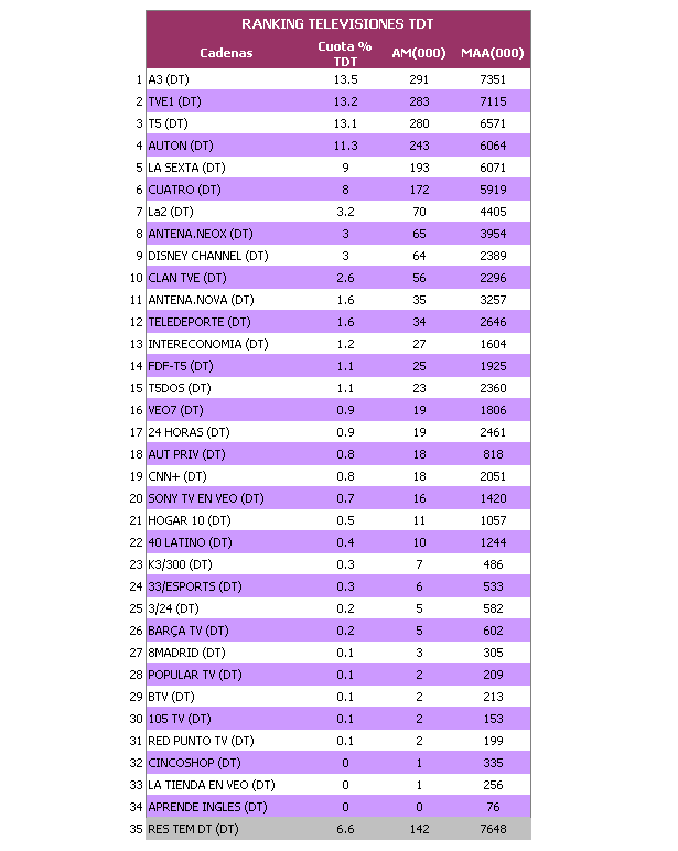 Catalunya toma este mes la delantera a Madrid en cuanto a penetración de la TDT con un 39,6% frente al 38,1%. No obstante, y gracias al cable, Euskadi es la región donde el analógico es minoritario, con sólo el 31,4% de cuota de pantalla. Castilla La Mancha es todavía la comunidad con más porcentaje de sintonía en analógico con un 63,4% de cuota de pantalla.