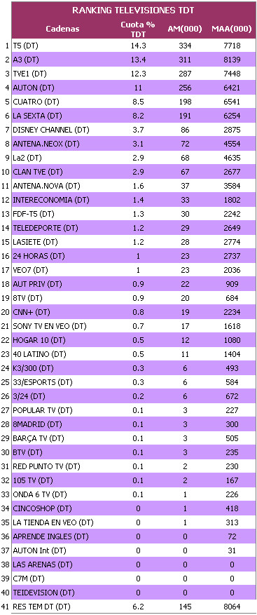 La TDT se apuntó en junio otro récord de penetración con el 35,3% de cuota de pantalla, con una importante subida de 3,4 puntos, quedando el analógico terrestre con sólo el 43,8%.