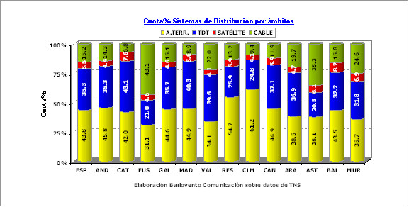Catalunya una vez más la delantera a Madrid en cuanto a penetración de la TDT con un 43,1% frente al 40,3%. No obstante, y gracias al cable, Euskadi es la región donde el analógico es minoritario, con sólo el 31,1% de cuota de pantalla. Castilla La Mancha es un mes más la comunidad con más porcentaje de sintonía en analógico con un 61,2% de cuota de pantalla.