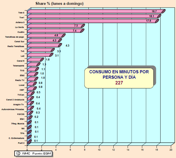 La Asociación para la Investiagión de Medios de Comunicación (AIMC) ha hecho hoy públicos los datos de la segunda oleada del Estudio General de Medios. Esta macroencuesta sobre el consumo de medios de los españoles otorga a Telecinco el liderazgo de octubre de 2008 a mayo de 2009 con un 18,7% de cuota de pantalla. Le sigue La 1 con el 18,1% y Antena 3 con el 17,8%. A gran distancia se coloca laSexta que, con un 7,5% de cuota, se impone a Cuatro (7,4%).