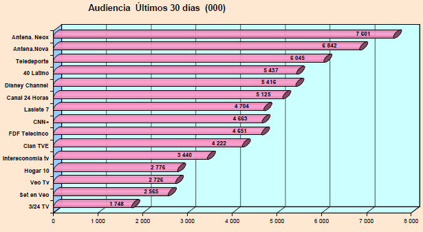 Antena.Neox fue el canal temático más visto de la TDT, seguido del otro canal del Grupo Antena 3, Nova. En infantiles, Disney Channel supera a Clan TVE.