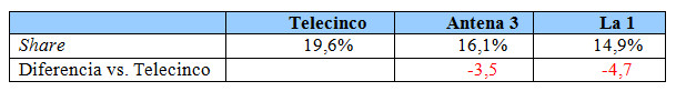 La hegemonía de esta ficción policial se hace evidente en su banda de competencia, donde se distancia en 3,5 puntos de Antena 3 (16,1%) y en 4,7 puntos de TVE 1 (14,9%).