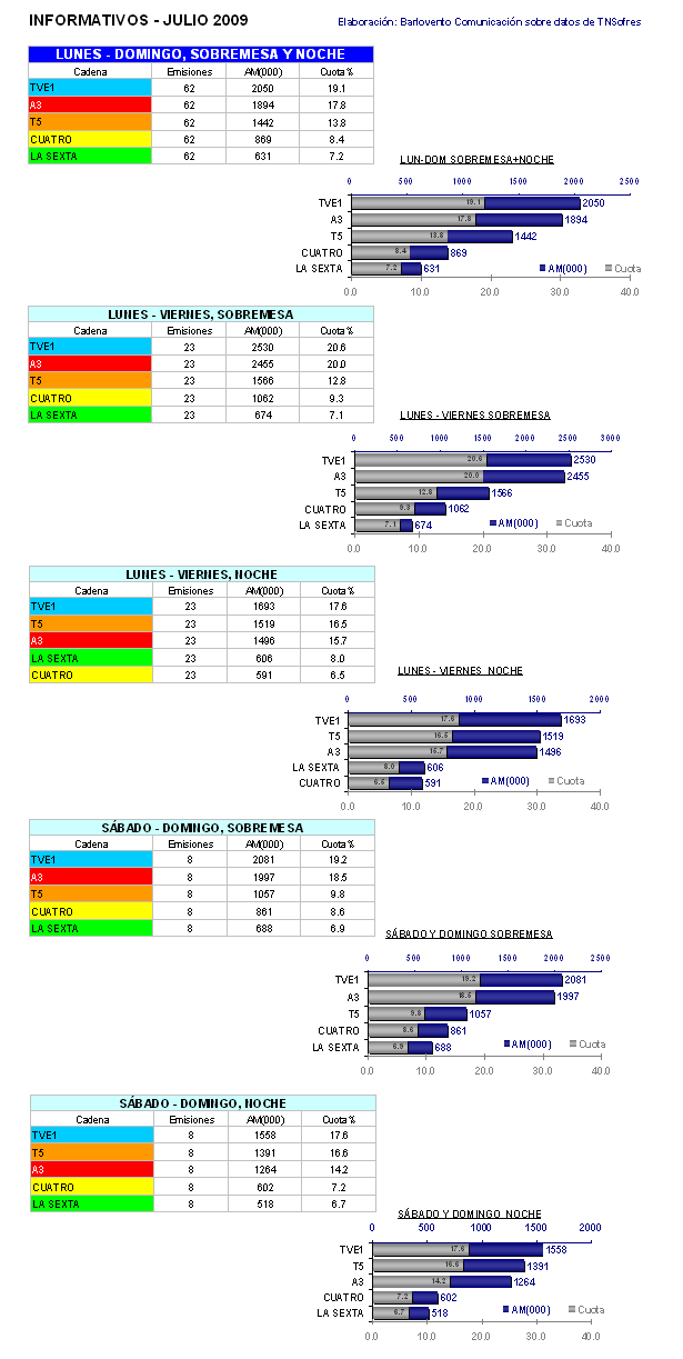 Con respecto al mes de junio, son La 1, Antena 3 y laSexta las únicas cadenas cuyos informativos ganan en audiencia teniendo en cuenta su emisión semanal (lunes-domingo) y las principales ediciones (sobremesa y noche). La 1 gana 2 décimas y laSexta 4 décimas, sin embargo, es Antena 3 la que experimenta una mayor crecida tras anotar un 17,8% frente al 16,6% de junio. Esta subida se centra en la mejoría cosechada por 'Antena 3 Noticias 2', tras la desaparición de '¿Quién quiere ser millonario?'.