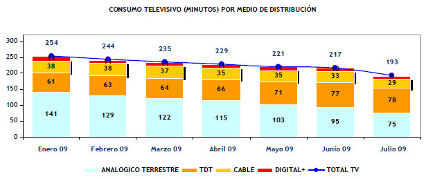 Las emisiones TDT representan en julio un promedio de 78 minutos al día por persona, es decir, el 40,2% del consumo televisivo total (un incremento de casi cinco puntos respecto del mes anterior), mientras el share de las emisiones analógicas sigue decayendo y en julio representa el 38,9%. El resto de la audiencia, un 20,9%, procede de las diferentes plataformas multicanal de pago.