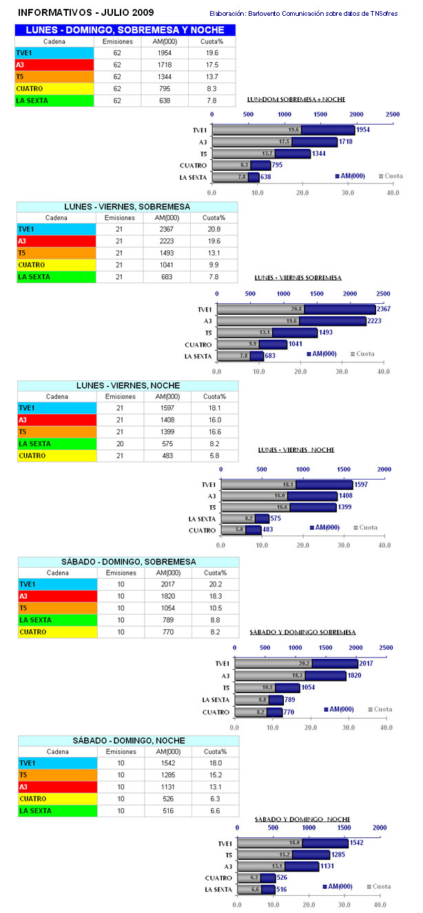 Con respecto al mes de julio, laSexta es la única cadena cuyos informativos ganan en audiencia teniendo en cuenta su emisión semanal (lunes-domingo) y las principales ediciones (sobremesa y noche). laSexta pasa de un 7,2% (631.000) a un 7,8% (638.000), lo que supone un crecimiento total de 6 décimas. El resto de cadenas pierde fuerza: Cuatro y Telecinco bajan ligeramente una décima, Antena 3 pierde 3 puntos y La 1 cae medio punto.