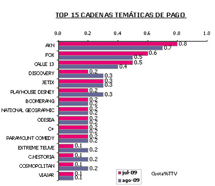Sin tener en cuenta las cadenas generalistas, Fox supera a Canal+ en la primera posición con un 3,7% de share, quedando Canal+ en segundo lugar con un 3,4% de cuota de pantalla, aunque gana audiencia. Anota un 2,9% (sube medio punto respecto a julio), pero cae a la séptima posición en el ranking absoluto. El tercer puesto es para TNT y AXN cae al décimo puesto en el ranking absoluto con un 2,0%, cae tres décimas con respecto al mes anterior.