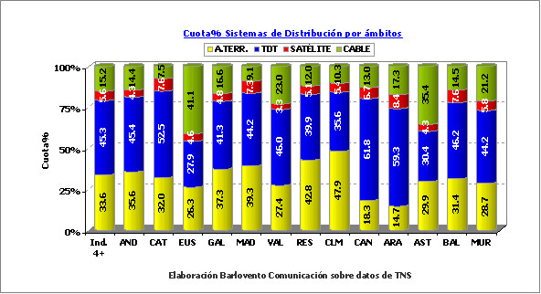 Nuevo récord para la penetración de TDT que en el mes de septiembre, logra un 45,3% quedando, como es lógico, por encima del sistema analógico (33,6%). Con respecto a agosto, sube el Cable (15,2%) y el Satélite baja (5,6%). Los ámbitos donde mayor aceptación tiene la TDT son Aragón, Canarias y Cataluña, superando en las tres el 50%, incluso el 60% en el caso de Canarias.