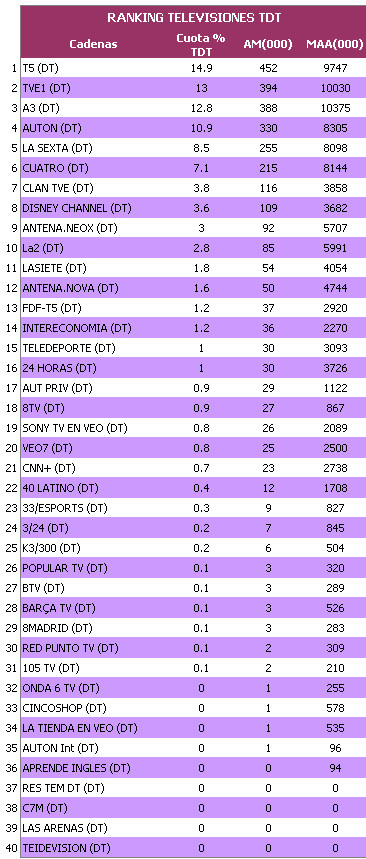 En cuanto a los grupos, TVE mantiene el liderazgo cayendo cerca de medio punto respecto al mes anterior, Gestevisión logra la segunda plaza ganando dos enteros y superando al Grupo Antena 3, que retrocede más de un punto y se tiene que conformar con el tercer puesto. El Grupo de laSexta se mantiene igual que el mes anterior tras la implantación de Gol TV, cuyos datos no han sido estimados. En cuanto a Sogecable, el Grupo cede tres décimas y se queda en la quinta plaza.