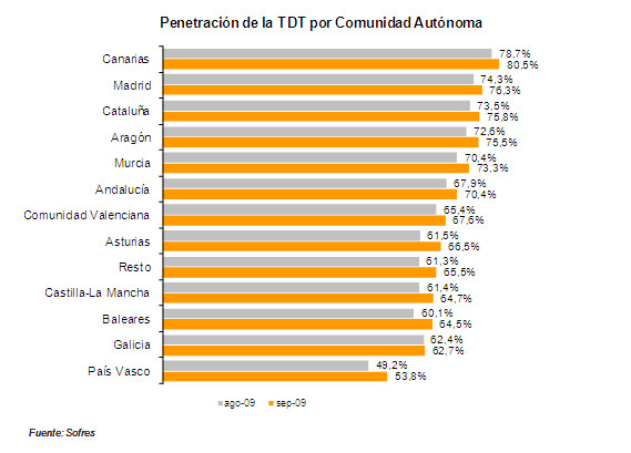 Los datos facilitados por Sofres, señalan que en septiembre la penetración de la TDT alcanzaba al 70% de los hogares. En el último mes, este indicador se ha incrementado en 2,7 puntos netos, mientras que desde el comienzo de 2009 el aumento ha sido de 26,3 puntos. Es decir, en los nueve primeros meses del año, más de la cuarta parte de los hogares españoles han adaptado su equipamiento para recibir la señal de la TDT.