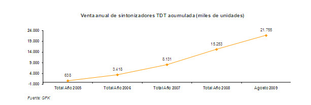 Un total de 679.220 nuevos equipos de TDT se han comercializado durante el mes de agosto. Se demuestra con este dato que la inercia de los apagados analógicos de la Fase I, que empezaron a producirse en junio, se ha trasladado al buen comportamiento de las ventas. De esta forma, el acumulado histórico de los receptores de TDT comercializados en España desde 2005 llega a los 21,8 millones de unidades, de los cuales el 30% del total, es decir 6,5 millones, corresponden a las ventas de los ocho primeros meses de 2009.