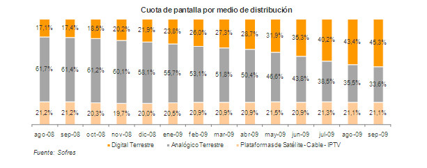 Este rápido incremento de la audiencia TDT durante los meses del verano supone la reducción del peso de la distribución analógica. Si en julio de 2009 la TDT superaba por primera vez en audiencia a la televisión tradicional, dos meses después la diferencia es ya de 11,7 puntos. En septiembre, la TDT acumula el 45,3% del tiempo total dedicado a la televisión, frente al 33,6% de la difusión analógica y el estable 21,1% del resto de sistemas multicanal (mayoritariamente de pago).