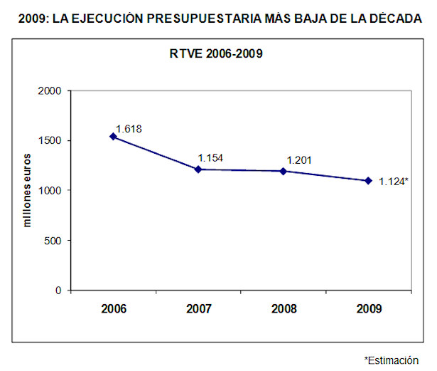 De acuerdo con el compromiso de total transparencia adquirido por la dirección de RTVE, el cierre de cuentas del tercer trimestre de 2009 permite prever que a final de año se logrará el equilibrio presupuestario a que obliga el mandato marco e incluso lograr una reducción de la aportación del Estado. La estimación de presupuesto para 2009 es de 1124 millones de euros.