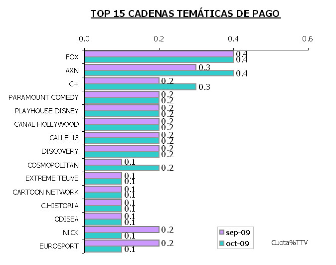 Respecto a las cadenas Temáticas de Pago, retrocenden cinco décimas y se quedan con un 7,5% de cuota de pantalla, siendo Fox y AXN las que recauda una mayor audiencia con un 0,4% sobre el total, siguiéndoles Canal+ con un 0,3%.