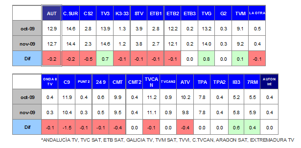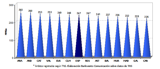 247 minutos es la media que cada español ha dedicado a ver cada día la televisión. Este dato supone un incremento de 2 minutos con respecto a noviembre 2008 y de 18 minutos con respecto a octubre 2009, consecuencia de la bajada de temperaturas. Los ámbitos televisivos que se muestran más afines al medio son Aragón, Andalucía, Cataluña, Valencia y País Vasco.