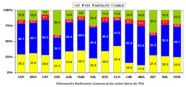 La TDT ya prácticamente supone la mitad del tiempo que se ve la televisión en España consiguiendo su máximo histórico, en detrimento del Analógico Terrestre (29,2%) que vuelve a firmar su mínimo histórico mensual. Por su parte el Cable (15,6%) y el Satélite (5,7%) experimentan un crecimiento de dos y una décima, respectivamente. Los ámbitos geográficos de mayor consumo de TDT son Canarias y Aragón, por otra parte la comunidad que dedica más minutos a ver la televisión.