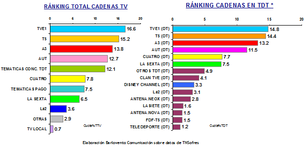 El ránking de cadenas exclusivamente en el sistema TDT sitúa a La1 (14,8%) como la cadena más vista, seguida de Telecinco (14,4%) y Antena3 (13,2%).
