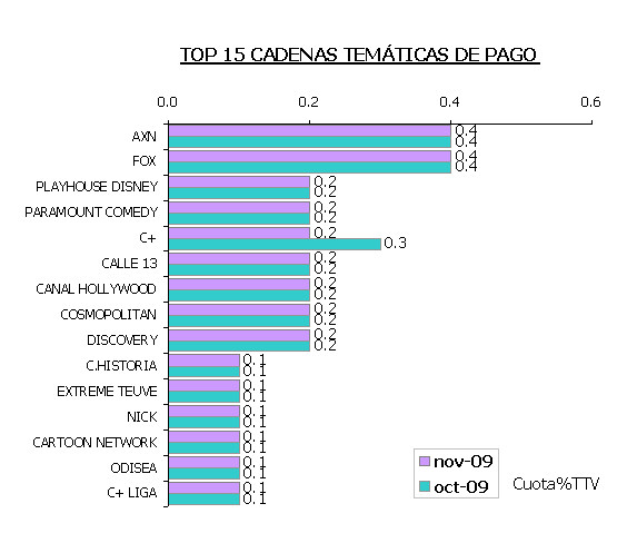 Respecto a las cadenas Temáticas de Pago, se mantienen igual que en el mes de octubre con un 7,5% de cuota de pantalla, siendo AXN y Fox las que recaudan una mayor audiencia con un 0,4% sobre el total.